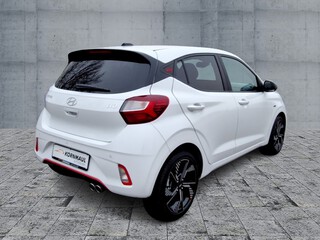 Sonderlackierung Atlas White Uni, 2 Lautsprecher, 3. Bremsleuchte, Abbiegelicht, Ablagebox / Stauraum unter Kofferraumboden, Airbag Beifahrerseite, Airbag Beifahrerseite abschaltbar, Airbag Fahrerseite, Aktives Bremslicht (ESS), Alarmanlage, Anti-Blockier-System (ABS), Audiobedienung am Lenkrad, Audiosystem: Radio RDS, Touchscreen-Farbdisplay (8.0 Zoll), Außenspiegel elektr. anklappbar, Außenspiegel elektr. verstell- und heizbar. beide, Außenspiegel Phantom Black, Blinkleuchte in Außenspiegel integriert, Bordcomputer, Bordcomputer mit TFT-Farbdisplay. hochauflösend, Dachhimmel schwarz, Dachspoiler, Design- und Ausstattungslinie N Line, Einparkhilfe hinten, Einschaltautomatik für Fahrlicht / Lichtsensor, Elektron. Stabilitätskontrolle (ESC) mit Bremsassistent, Fahrassistenz-System: aktiver Spurhalteassistent (LKAS. Lane Keep Assist System), Fahrassistenz-System: Aufmerksamkeits-Assistent, Fahrassistenz-System: Autonome Notbremsfunktion inkl. Frontkollisionswarnung (FCA), Fahrassistenz-System: Autonome Notbremsfunktion inkl. Fahrradfahrererkennung (FCA-Cyc.), Fahrassistenz-System: Autonome Notbremsfunktion inkl. Fußgängererkennung (FCA-Ped.), Fahrassistenz-System: Berganfahrhilfe, Fahrassistenz-System: Fernlichtassistent, Fahrassistenz-System: Sicherheitssystem mit automatischem Notruf (ERA GLONASS / eCall), Fahrassistenz-System: Verkehrszeichenerkennung. erweitert (Geschwindigkeits-Regel-/Begrenzeranlage), Fensterheber elektr. mit Einklemmschutz, Fensterheber elektrisch hinten, Fensterheber elektrisch vorn, Freisprecheinrichtung Bluetooth, Gepäck-/Laderaumleuchte, Geschwindigkeits-Begrenzeranlage (Speed-Limiter), Getriebe 5-Gang, Gurtstraffer, Heckleuchten LED, Heckscheibe heizbar, Heckscheibenwischer, Isofix-Aufnahmen für Kindersitz, Karosserie: 5-türig, Komfort-Paket, Gepäcknetz im Koffer-/Laderaum, Gepäckraumboden höhenverstellbar, Induktionsladeschale für Smartphone, Innenraumfilter: Pollenfilter, Klimaautomatik, Mittelarmlehne vorn, Kopf-Airbag-System, Kopfstützen hinten verstellbar, Lenkrad (Leder) mit Multifunktion, Lenkrad heizbar, Lenkrad mit Multifunktion, Lenksäule (Lenkrad) höhenverstellbar, Lifetime MapCare (Internetbasierende Dienste), LM-Felgen, Modellpflege, Motor 1.0 Ltr. - 66 kW TGDI KAT, Navigationssystem, Service-System: Remote Services (Blue Link), Nebelscheinwerfer, Nebelschlussleuchte, Otto-Partikelfilter (OPF), Projektor-Scheinwerfer, Radioempfang digital (DAB+), Reifen-Reparaturkit, Reifendruck-Kontrollsystem, Rückfahrkamera, Rücksitzlehne geteilt/klappbar, Schadstoffarm nach Abgasnorm Euro 6e, Schalt-/Wählhebelgriff Leder, Seitenairbag vorn, Service-System: Online Update OTA (Over The Air), Sitz vorn links höhenverstellbar, Sitzbezug / Polsterung: Stoff, Sitzheizung vorn, Smartphone Schnittstelle (Apple CarPlay & Android Auto), Start/Stop-Anlage, Tagfahrlicht LED, Türgriffe außen Wagenfarbe, USB-Anschluss Mittelkonsole, Verglasung hinten abgedunkelt (Privacy Glass), Warnanlage für Sicherheitsgurte. Fahrer-/Beifahrerseite, Wegfahrsperre (elektronisch), Zentralverriegelung mit Fernbedienung
