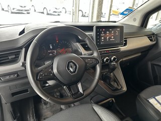 Türgriffe in Wagenfarbe, Kunststoffboden im Laderaum, Ganzjahresreifen, LED-Beleuchtung im Laderaum, Weitwinkelspiegel, Smartphonehalterung, Seitenairbag Fahrer + Windowairbag vorne, Fahrersitz mit verstellbarer Lendenstütze, Einparkhilfe hinten, Renault Keycard Handsfree, Frontairbag für Fahrer und Beifahrer (deaktivierbar), Klang & Klima Paket 2 mit Navigation, Flexwheels 16-Zoll "Liman", Induktives Laden + Mittelkonsole mit Armlehne + Staufach, Rear View Assist und Rückfahrkamera, Außenspiegel elektrisch einstellbar, beheizbar u. anklappbar, Zentralverriegelung mit Funkfernbedienung, Fahrerairbag, Standardlackierung ohne Aufpreis, Kühlflüssigkeit, 42-Zoll Instrumententafel mit Farb-Display, Tempopilot mit Geschwindigkeitsbegrenzer, Radio Connect R&GO, Beifahrersitz umklappbar, Schiebetür rechts ohne Fenster, Standardbereifung, Stoffpolsterung "KILYA", Fahrersitz längs- und höhenverstellbar, Lenkrad aus Kunststoff, Vario-Trennwand vergittert und drehbar, Klassische seitliche Innenverkleidung halbhoch, Klimaanlage manuell, Ohne Heckscheibenwischer, Licht- und Regensensor, 15-Zoll-Stahlfelgen, Kunststoffboden in der Fahrerkabine, Mobilitäts-Set, Ohne ISOFIX-Kindersitzbefestigungssystem