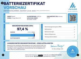 Pyrénées-Weiß, Batteriekauf, Paket URBAN NIGHT, Überführungskosten, Klimaautomatik, Kopf- und Thoraxairbags, Außenspiegel farblich abgesetzt, Zentralverriegelung, Tempopilot mit Geschwindigkeitsbegrenzer, LED-Tagfahrlicht, ISOFIX-Befestigung Rücksitzbank, Ladekabel Typ2/Typ2 (Mode3), Innenlook-Paket in Schwarz, Kühlergrill mit Zierelementen in Weiß, Stoff-Kunstlederpolsterung Urban Night, Flexicase: Ablagefach unter der Rücksitzbank, Induktive Smartphoneladefläche, Standardlackierung ohne Aufpreis, Rücksitzlehne mit verstellbarem Neigungswinkel, Lenkrad höhenverstellbar, Bordcomputer, Kofferraumabdeckung, Smartphone-Integration via Android Auto, Connectivity, Reifendruck-Kontrollsystem, EASY LINK mit Navigation inkl. Sound-System mit Subwoofer, Türgriffe in Wagenfarbe lackiert, 16-Zoll-Leichtmetallräder Urban Night in Schwarz, Striping Schwarz Light Urban Night, Radiosatellit am Lenkrad, Rücksitzlehne geteilt umklappbar, Kopfstützen hinten, Sitzheizung für Vordersitze, Lenkrad aus Leder, Servolenkung, i-Size Befestigung Rücksitze, Einparkhilfe hinten mit Rückfahrkamera, Seitenschutzleisten in Wagenfarbe mit Zierleiste, Flexicase: Ablagefach in den hinteren Türen, Heckscheibe und hintere Seitenscheiben stark getönt, Fensterheber vorne elektrisch mit Impulsschaltung, Fahrersitz höhenverstellbar + Beifahrersitz one touch, Badges Urban Night, Licht- und Regensensor, 16-Zoll-Leichtmetallräder, Außenspiegel elektrisch einstell- & beheizbar, Spurhalte-Warner, Flexicase: geschlossenes Handschuhfach, Flexicase: offenes Ablagefach zwischen den Vordersitzen inkl, Mobilitäts-Set 12-V-Kompressor und Reifendichtmittel, Geräuschsimulator Z.E. Voice (Akustisches Warnsystem - AVAS), kabellose Smartphone-Replikation