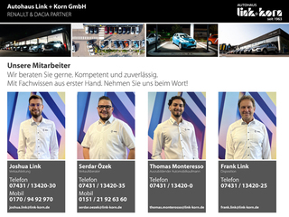 Automatik, Bordcomputer, Totwinkel-Assistent, Regensensor, Lichtsensor, Berganfahrassistent, Klimaautomatik, Servolenkung, Zentralverriegelung, Elektrischer Fensterheber, Elektrische Aussenspiegel, Tempomat, Standheizung, Multifunktionslenkrad, Lenksaeule einstellbar, ParkDistanceControl vorne und hinten, Geschwindigkeitsbegrenzungsanlage, Funkfernbedienung, LED-Tagfahrlicht, Nebelscheinwerfer, Aussenspiegel beheizbar, Rückfahrkamera, ABS, Airbag, Beifahrer-Airbag, Wegfahrsperre, ESP, Reifendruckkontrolle, Traktionskontrolle, Kindersitzbefestigung, Navigationssystem, Radio, USB-Anschluss, MP3, Freisprecheinrichtung, Apple CarPlay, Android Auto, DAB, Touchscreen, Garantie, Scheckheftgepflegt, Nichtraucherfahrzeug, Elektrische Parkbremse, Allwetterreifen, Schiebetür rechts, USB-Anschluss, Reifen-Reparaturkit, Fensterheber elektr. mit Impulsgeber links vorn, Geschwindigkeits-Regelanlage (Tempomat), Audiosystem Radio Connect (Bluetooth-/USB-Schnittstelle, R&GO), Sitzbezug / Polsterung: Stoff Kilya, Elektromotor 90 kW (cont. 51 kW), Klimaautomatik mit Wärmepumpe und Schnellheizer, Sitz vorn links höhen-/längsverstellbar, Rückfahrkamera, Tagfahrlicht LED, Lenksäule (Lenkrad) höhenverstellbar, Licht- und Regensensor, Airbag Fahrerseite, Außenspiegel elektr. verstellbar, Außenspiegel elektr. verstell- und heizbar, Kombiinstrument digital (4,2 Zoll), Airbag Beifahrerseite, 12V-Steckdose im Laderaum, Außenspiegel elektr. anklappbar, Berg-Anfahr-Assistent (HSA), Elektron. Stabilitäts-Programm, Geschwindigkeits-Begrenzeranlage, Gurtwarner, Heckflügeltüren ohne Verglasung, Holzboden im Laderaum, Isofix-Aufnahmen für Kindersitz am Beifahrersitz, Karosserie/Aufbau: Kasten, Kunststoffboden im Laderaum, Lenksäule höhen-/längsverstellbar, Parkbremse elektrisch, Schiebetür rechts, Schnellladefunktion 22 kW (AC), Sicherheitssystem mit automatischem Notruf (ERA GLONASS / eCall), Sitz vorn rechts umklappbar, ZV mit Fernbedienung, Int.KnNr: LK-49E, Bei Uns erwerben Sie Ihr Fahrzeug aus familiärer Hand und mit Qualitätsversprechen aus 60 Jahren Tradition auf der Schwäbischen Alb!, Als innovatives und zukunftsorientiertes Autohaus bieten Wir Ihnen sowohl den klassischen Vertragshandel vor Ort als auch einen modernen 24 Stunden Online-Handel, Seit über 60 Jahren schenken Uns zahlreiche Kunden Ihr Vertrauen in Albstadt, in der Region, mittlerweile deutschlandweit!, Heute beschäftigen Wir in dritter Generation im mittelständischen Maß 25 MitarbeiterInnen am Standort Albstadt, Kundenbedarfsorientiert versprechen Wir als RENAULT und DACIA Vertragshändler den Erfolg jeder Fahrzeugsuche: Zwischen der Spanne des kleinsten RENAULT Twizy 2-Sitzers und dem RENAULT Master Kastenwagen kann jeder Wunsch Erfüllung finden, Finanzierung und Leasing:, Durch unsere Partnerbank unterstützt, ermöglichen Wir maßgeschneiderte Finanzierungs- und Leasingangebote für jede Lebenslage. Kaufpreiseinschätzung und Inzahlungnahme Ihres Altwagens anhand digitaler Fahrzeugbewertung ohne Besuch im Autohaus möglich, Bundesweiter Zulassungsservice, Auf Anfrage Lieferung vor die Haustür, Wir freuen Uns auf Ihre Anfrage und natürlich auf Sie! Irrtümer und Angabe Fehler vorbehalten, bitte überprüfen Sie die beworbene Ausstattung direkt am Fahrzeug da die Dateneingabe Fahrgestellnummern bezogen über die DAT erfolgt und hier Daten & Übertragungsfehler möglich sind. Unsere Inserate verstehen sich als Werbeanzeigen, daher bitten wir Sie die beschriebenen Ausstattungen direkt bei einer Besichtigung am Fahrzeug zu prüfen um Missverständnisse auszuschließen.